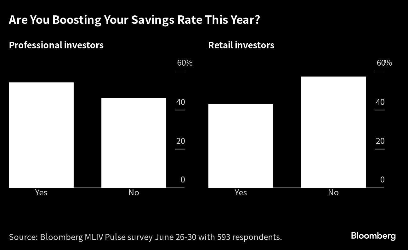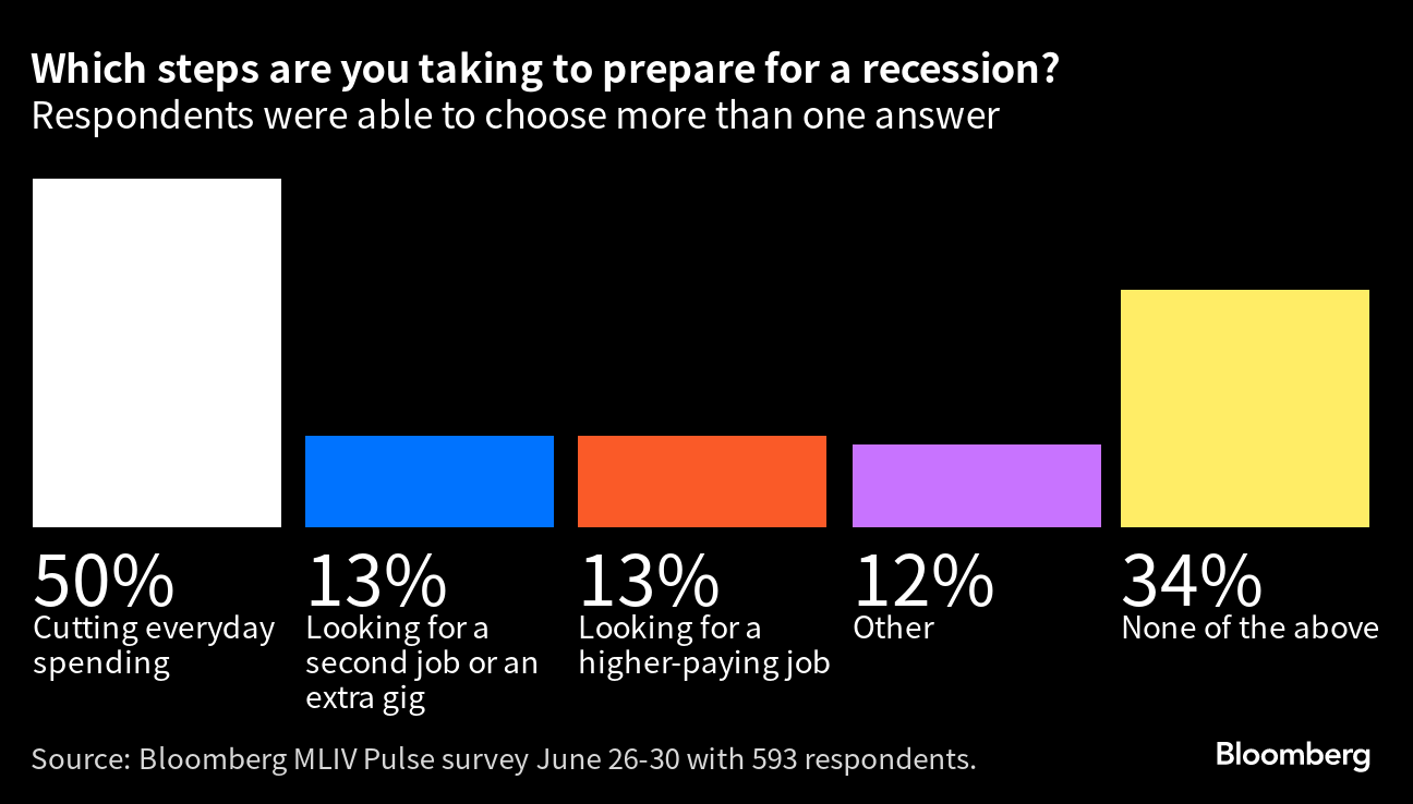 The risk of recession also emerged as a possible theme to hear about at July 4 festivities or similar gatherings elsewhere in the world, according to the MLIV Pulse survey with 593 respondents globally. At the same time, though — in what could be wishful thinking -- 48% of retail investors and 39% of professionals said they will absolutely avoid any conversation about finances at the next family get-together.
