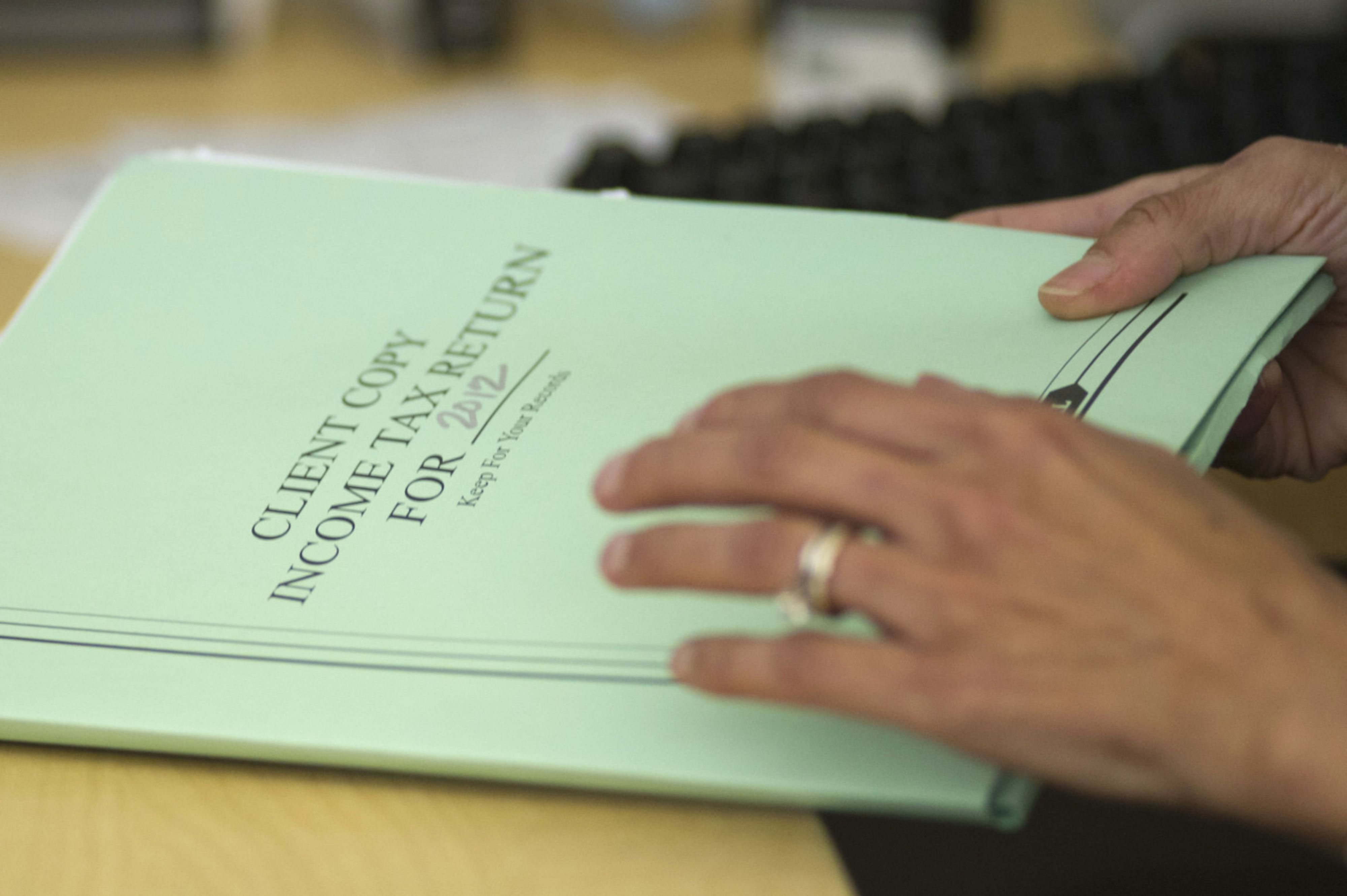 A tax adviser closes a folder containing tax forms. (Photographer: David Paul Morris/Bloomberg)