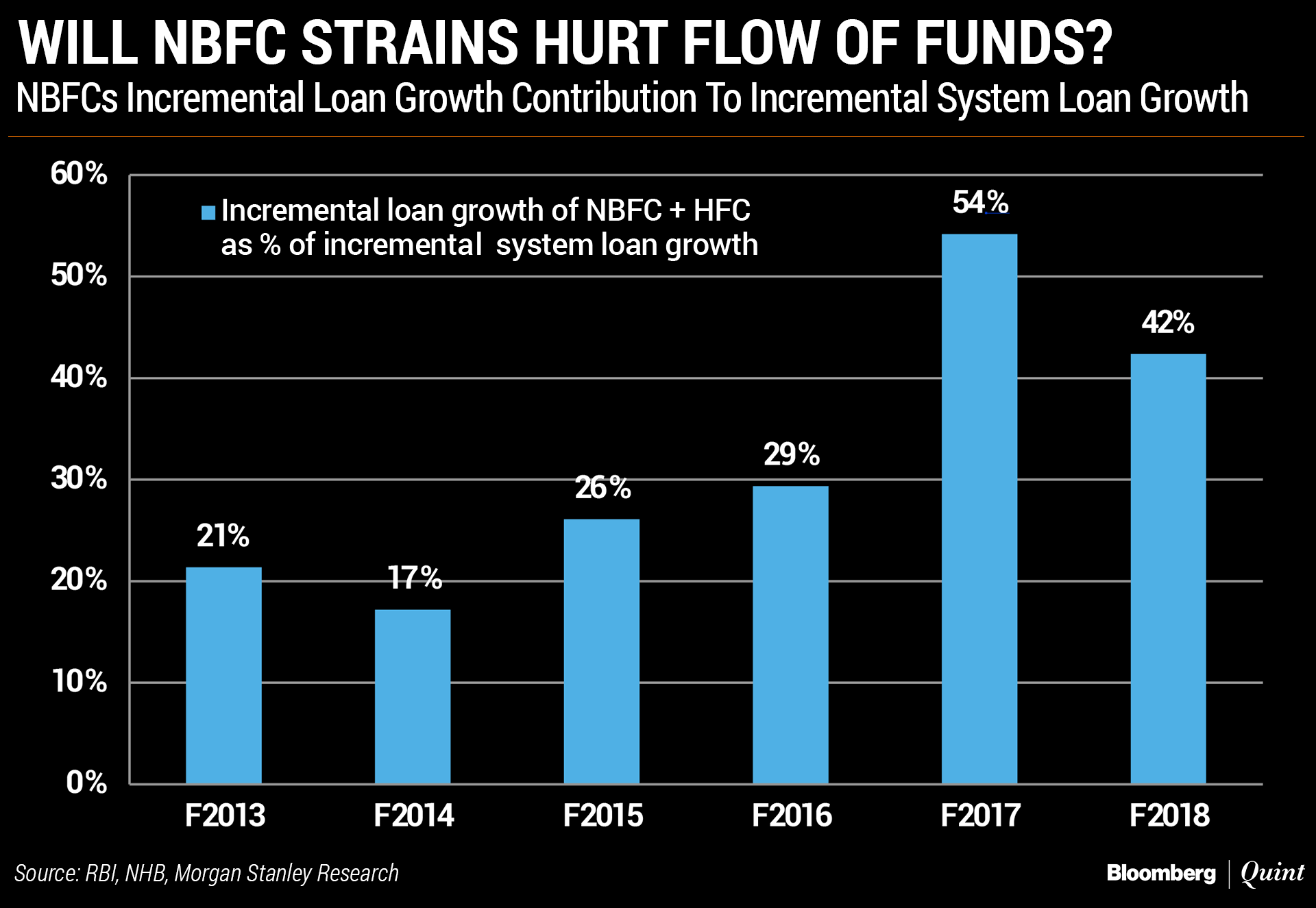 According to data put out by Morgan Stanley, in FY17, 54 percent of the incremental loan growth came from NBFCs. Last year, 42 percent of the incremental lending in the system came from NBFCs. The share of NBFCs in outstanding credit rose to 12.6 percent at the end of FY18 compared to 10.8 percent two years ago, Morgan Stanley data showed.