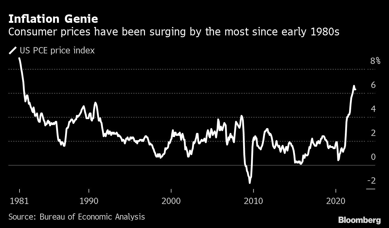 Just as happened some 40 years ago, the decline in gross domestic product will be driven by a central bank determined to rein in runaway consumer prices. The Fed's favorite inflation gauge is more than triple its 2% objective.
