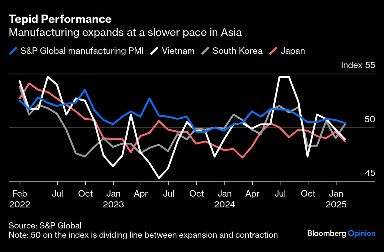 Growth in the region is well off the scorching levels that earned countries the mantle of Tiger economies in the 1980s and 90s. Thailand, an early manufacturing star, now has an anemic pace of growth; Capital Economics recently dubbed it “the new sick man of Asia.” Malaysia's expansion is respectable, but no world-beater. Singapore had a good 2024, though growth was tempered in the final three months. Vietnam, lauded as a rising power, is trying to streamline its bureaucracy and cut the size of government by 20%, all the while fretting that its giant trade surplus with the US will place it in Washington's crosshairs. Indonesia isn't satisfied with 5% growth, but nurses unrealistic ambitions to lift that clip to 8%. Factories in much of Asia expanded at a lackluster pace in January.