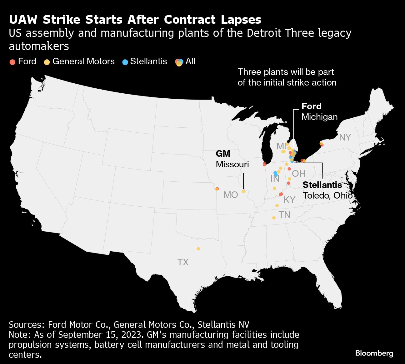 The United Auto Workers began a strike Friday against all three of the legacy Detroit carmakers, an unprecedented move that could launch a costly and protracted showdown over wages and job security. General Motors Co. offered 20% raises over four years, cost-of-living allowances and boosts to existing pensioners.