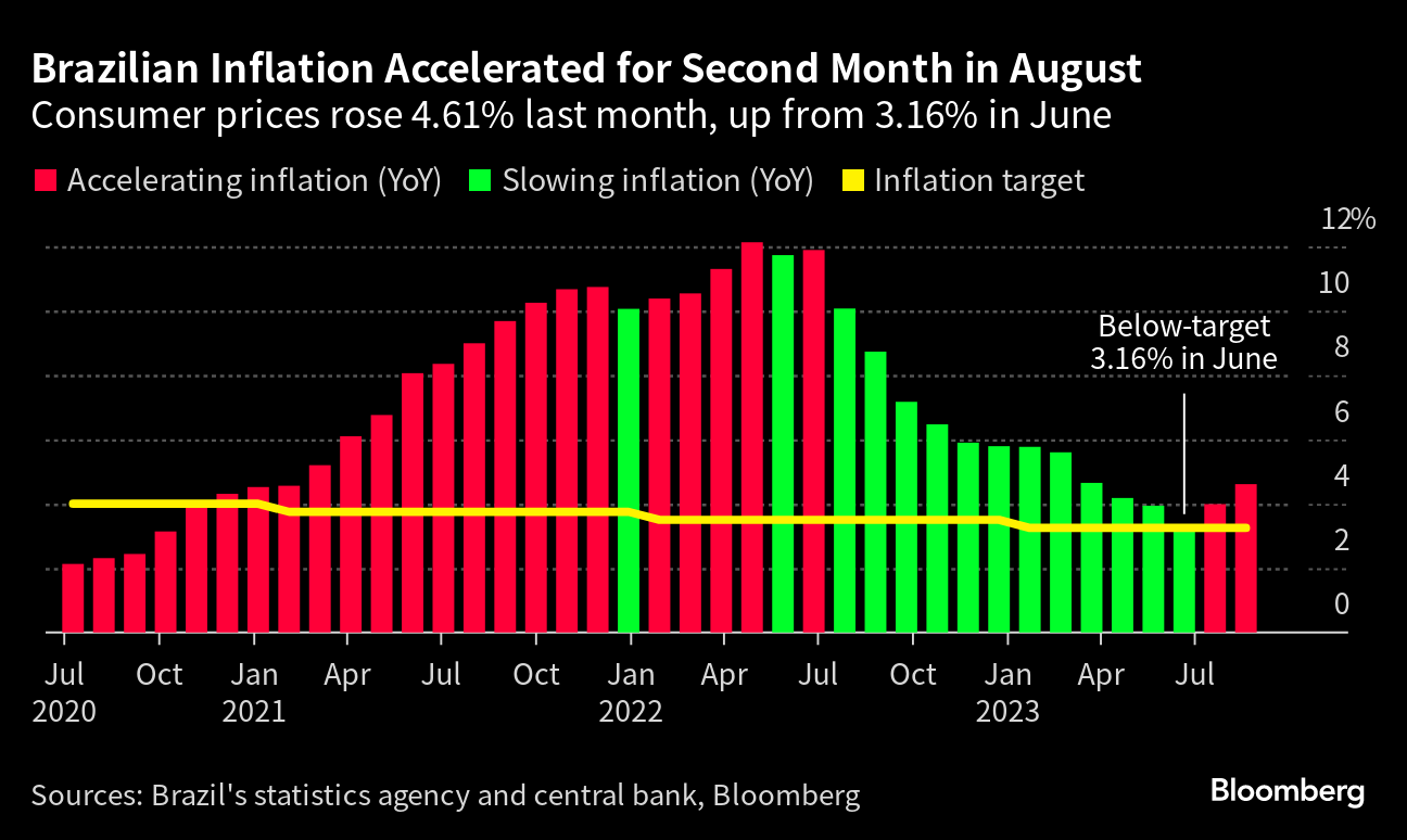 Brazil's annual inflation accelerated less than expected in August as central bankers prepare to extend interest rate cuts at next week's policy meeting. Still, annual inflation has now accelerated for two straight months as the economy delivers surprisingly strong growth and President Luiz Inacio Lula da Silva rejiggers energy costs.