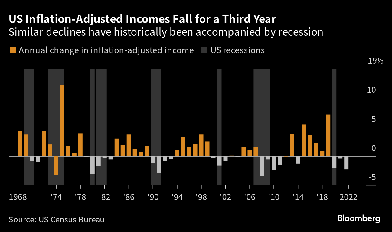 US inflation-adjusted household income fell in 2022 by the most in over a decade, highlighting the toll of a higher cost of living and the expiration of pandemic-era programs. The 2.3% drop in incomes — which was the most since 2010 — marked the third-straight annual decline, which has been a feature of past recessions like the global financial crisis, the dotcom bubble and the downturn in the early 1990s.