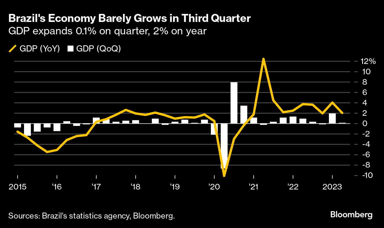 Elsewhere, Japan's economy contracted in the third quarter by more than initially reported, while Brazil's barely expanded in the period. Economists are betting on a more pronounced slowdown in Hong Kong given challenges from China and higher interest rates.