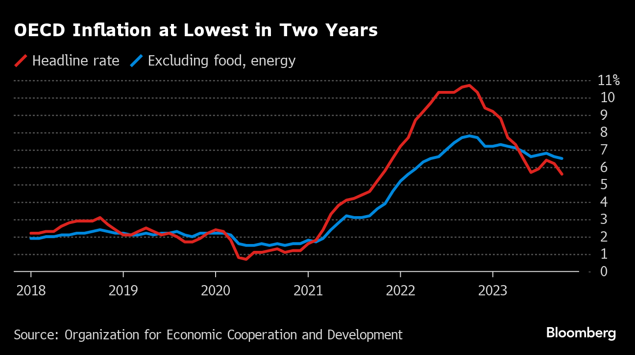 Price increases in OECD countries slowed in October to the weakest in two years in a sign that advanced economies are overcoming their worst inflation crisis in decades. The headline measure for the 38-member club, which includes all Group of Seven economies, dropped to 5.6% from 6.2% as food-cost pressures lessened rapidly and energy prices fell back in most countries.