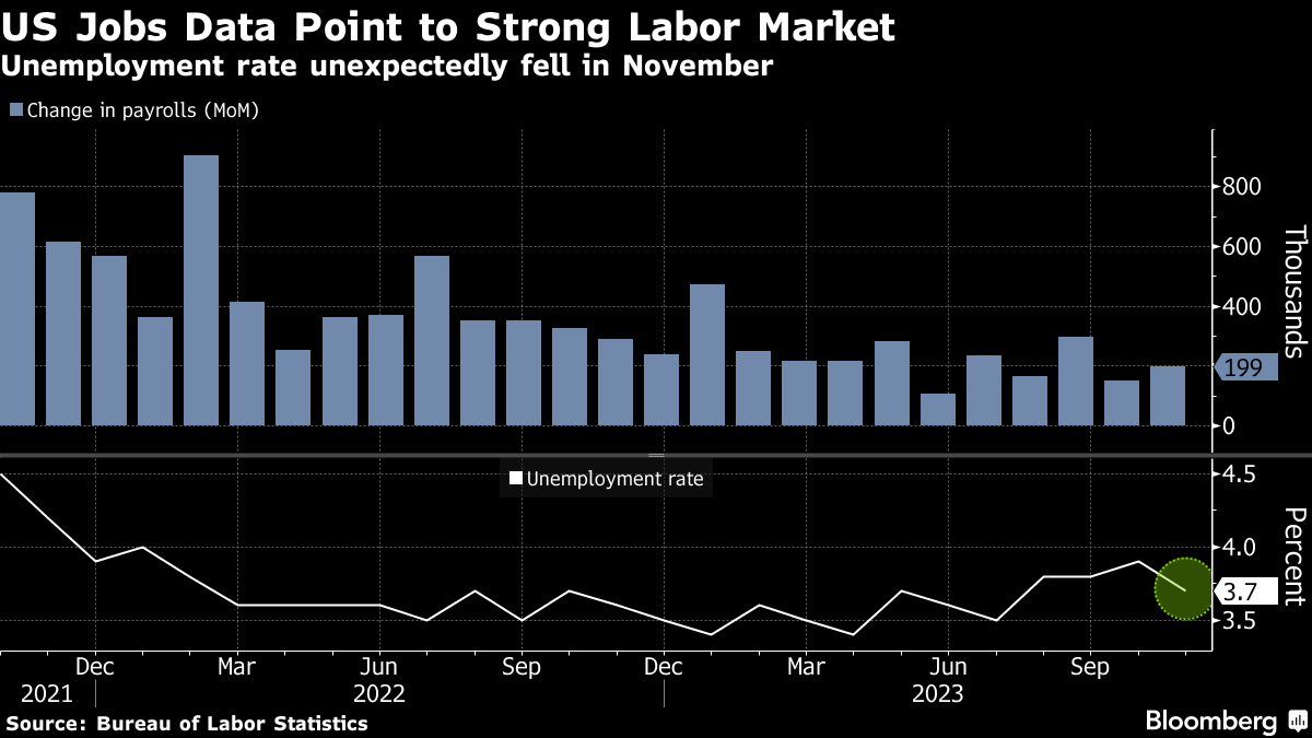 Payrolls increased 199,000 last month following a 150,000 advance in October. The return of striking auto workers helped boost the count by 30,000. The solid labor-market figures shift focus to inflation numbers this coming week as Fed officials gauge how long to maintain interest rates at this cycle's peak.