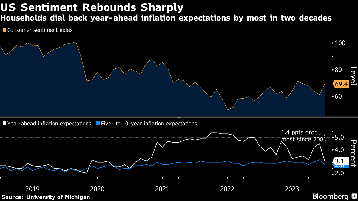 Consumer sentiment rebounded sharply in early December, topping all forecasts as households dialed back their year-ahead inflation expectations by the most in 22 years. Consumers see prices rising at an annual rate of 3.1% over the coming year, the lowest level since March 2021. The 1.4 percentage points decline from the prior month was the largest since October 2001.