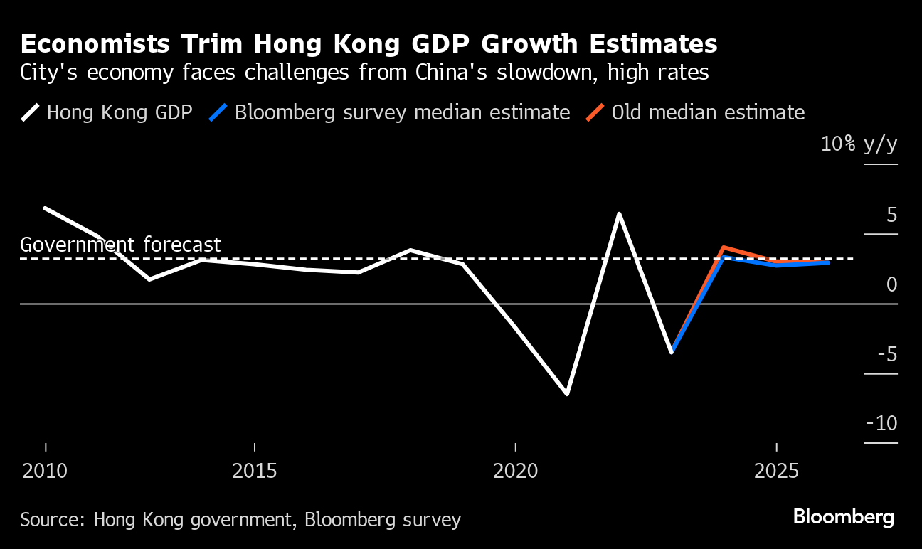 Hong Kong's economy will likely grow more slowly than previously expected both this year and next as challenges from China's slowdown and the impact from elevated interest rates weigh on the financial hub. The downgrades reflect a muted post-pandemic recovery as growth has been weak despite a boost this year from a tourism revival, and suggest that tough times are still ahead for the Asian financial center.