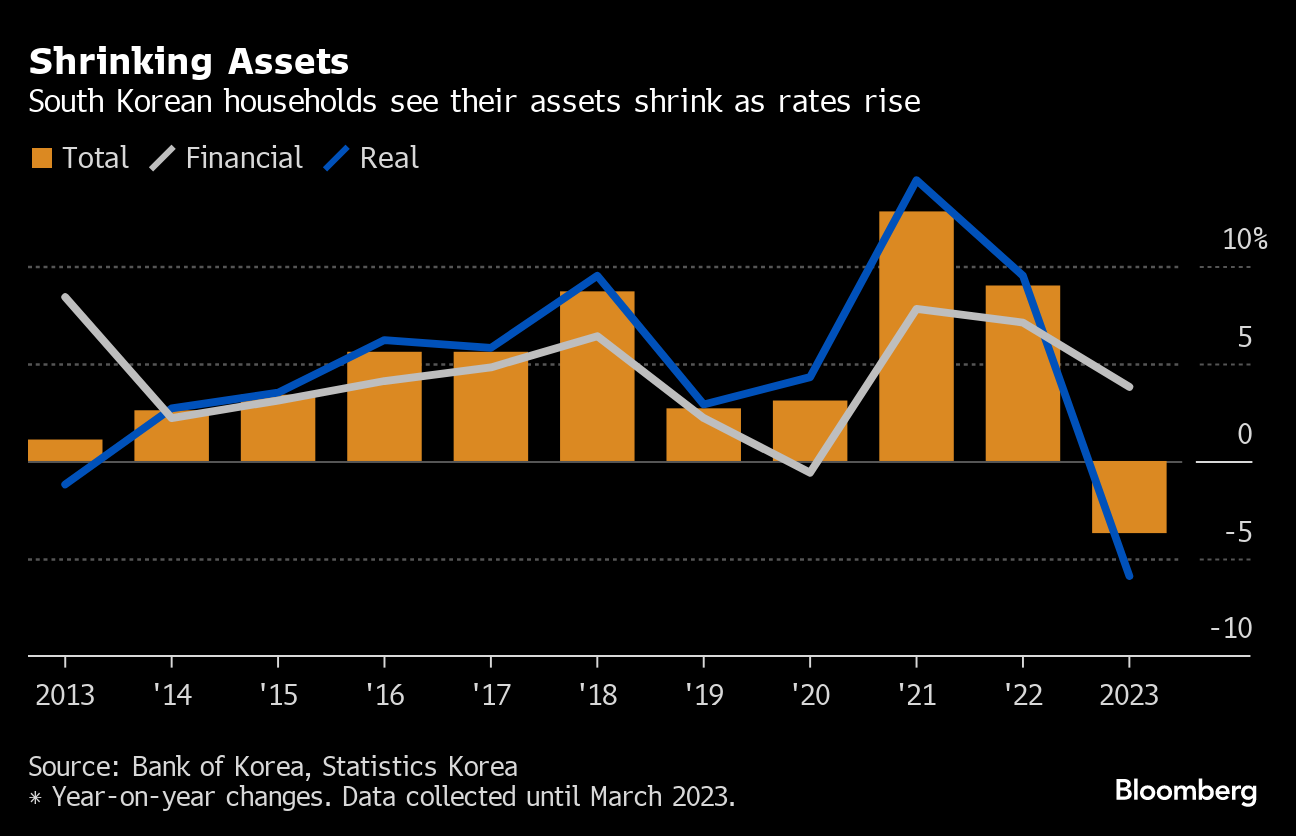 Assets held by South Korean households shrank for the first time in data going back a decade after the central bank rapidly raised interest rates, contributing to a correction in the property market.