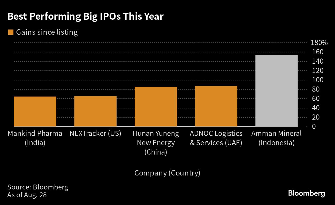 Shares of PT Amman Mineral Internasional, which owns the second-largest gold and copper mine in the Southeast Asian country, are up 153% since their debut on July 7. That's the biggest gain among 32 IPOs that raised at least $500 million so far globally in 2023, according to data compiled by Bloomberg.