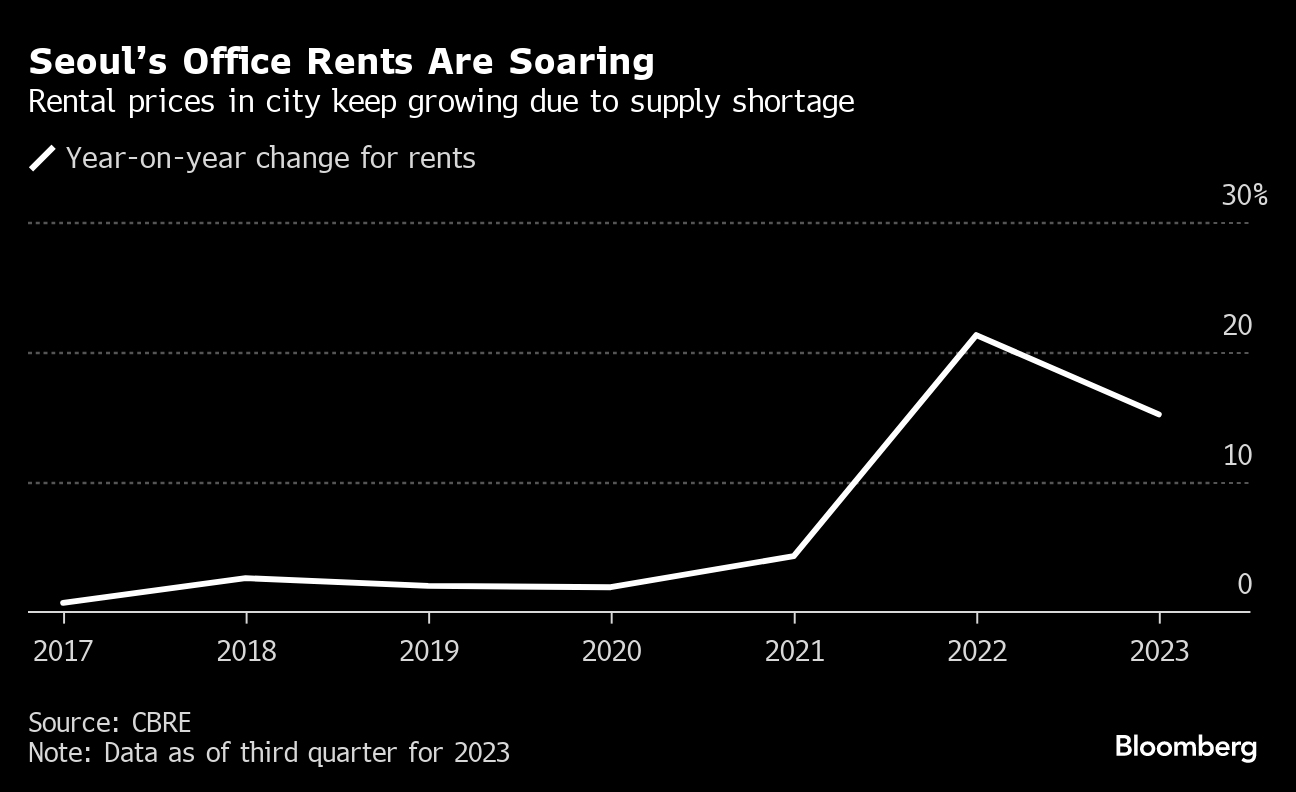 Offices have been in short supply in Seoul since 2021, with just half of what has historically been available, according to Claire Choi, head of research for Korea at CBRE. She expects the shortage will last until 2025, when new projects now under construction will come online, and rents to grow year-over-year about 15% in 2023.