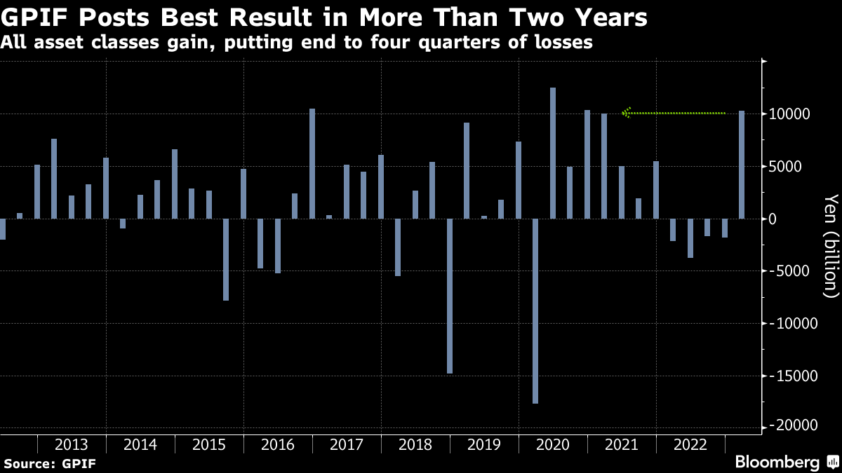 The Government Pension Investment Fund added 5.4% during the quarter, raising its total assets to 200.13 trillion yen ($1.39 trillion), the fund said in Tokyo Friday. Foreign equities were the top performers, gaining 8.2% as the US started to overcome a banking crisis, while Japanese shares advanced 7%. Overseas and domestic bonds also gained, while the yen weakened against the dollar as the Bank of Japan maintained its easy monetary policy.
