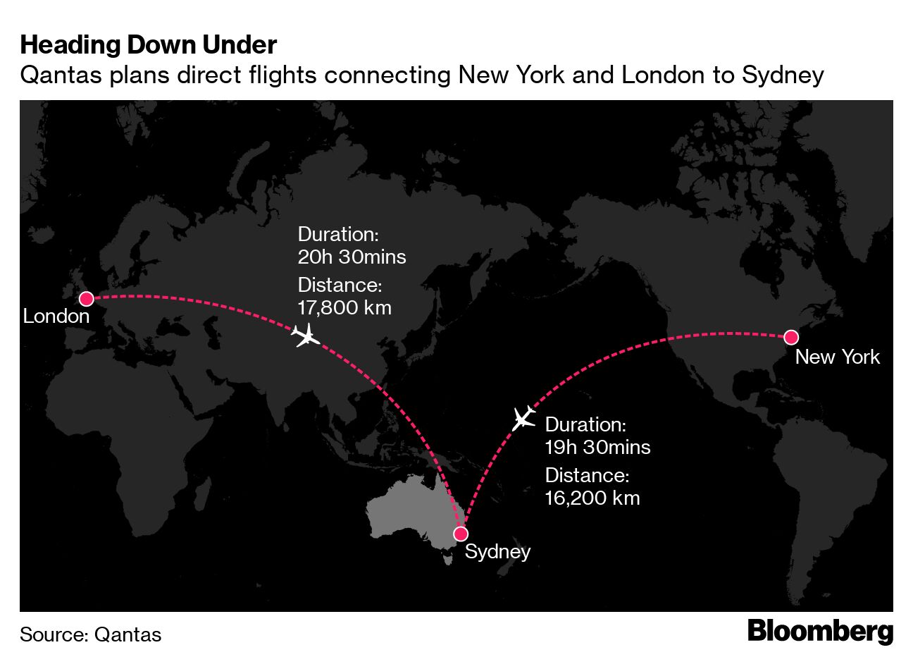 (Bloomberg) -- Qantas is likely to extract a 20% premium from passengers on the world's longest direct flights when it launches nonstop services connecting Sydney with New York and London in late 2025.