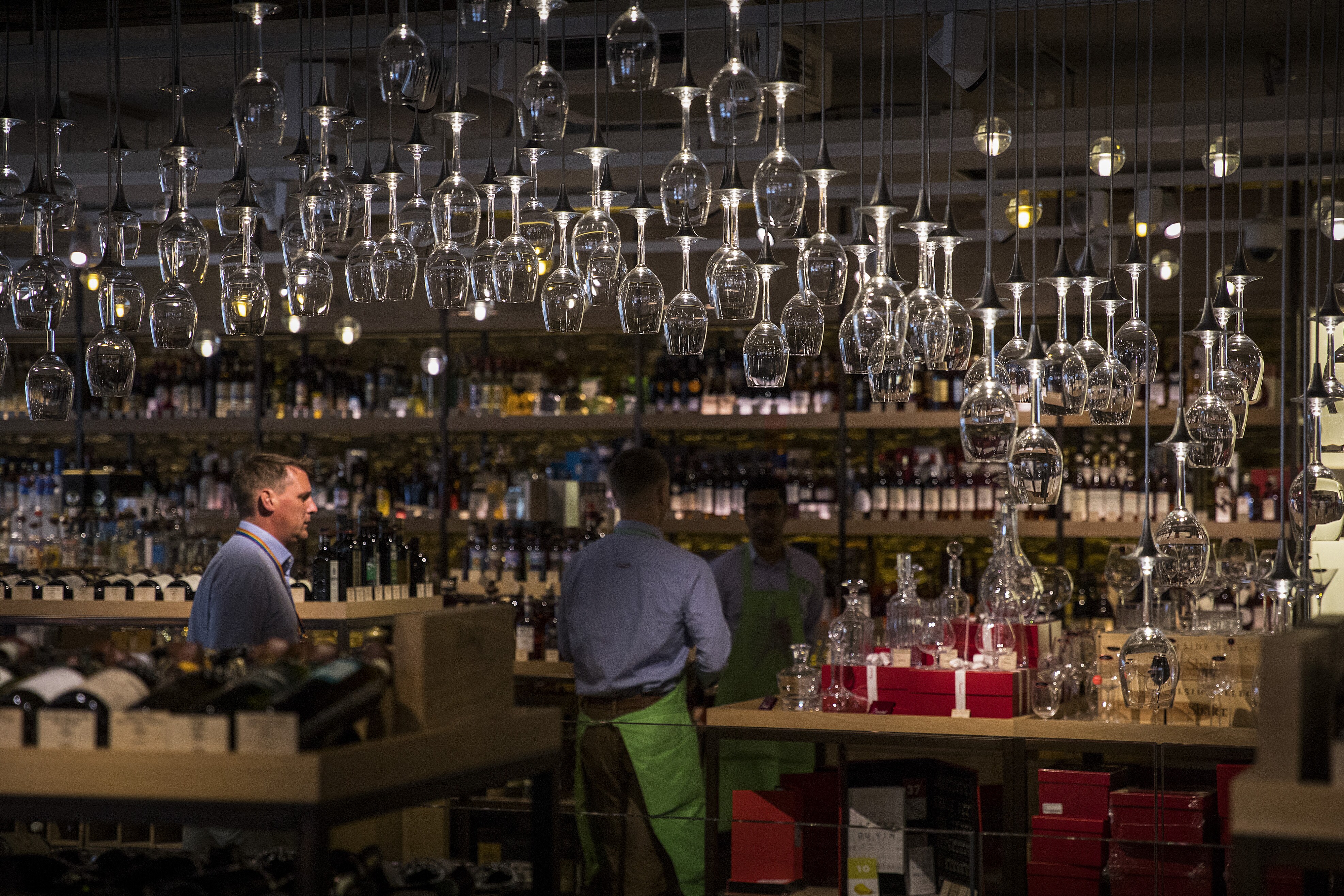 A chandelier of Riedel wine glasses hangs from the ceiling inside Hedonism wine emporium in the Mayfair district in London, U.K. (Photographer: Simon Dawson/Bloomberg)