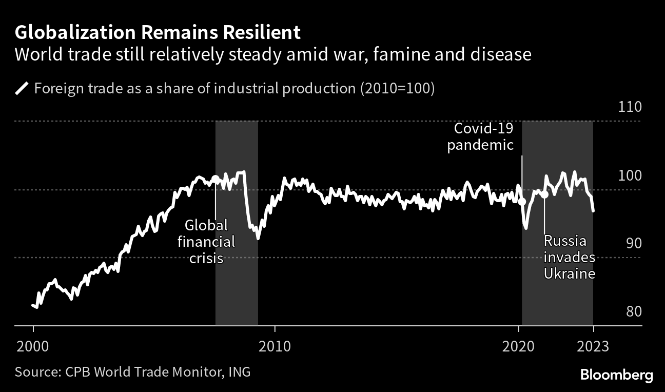Despite talk of globalization's demise, economic integration via cross-border commerce has shown remarkable resilience through war, famine and a pandemic. Over the past three years, world trade as a share of global production has softened a bit but remains largely in line with historical trends. In fact, there has been no meaningful shift in the trajectory toward greater trade openness since at least 2006, according to a recent ING Groep NV analysis.