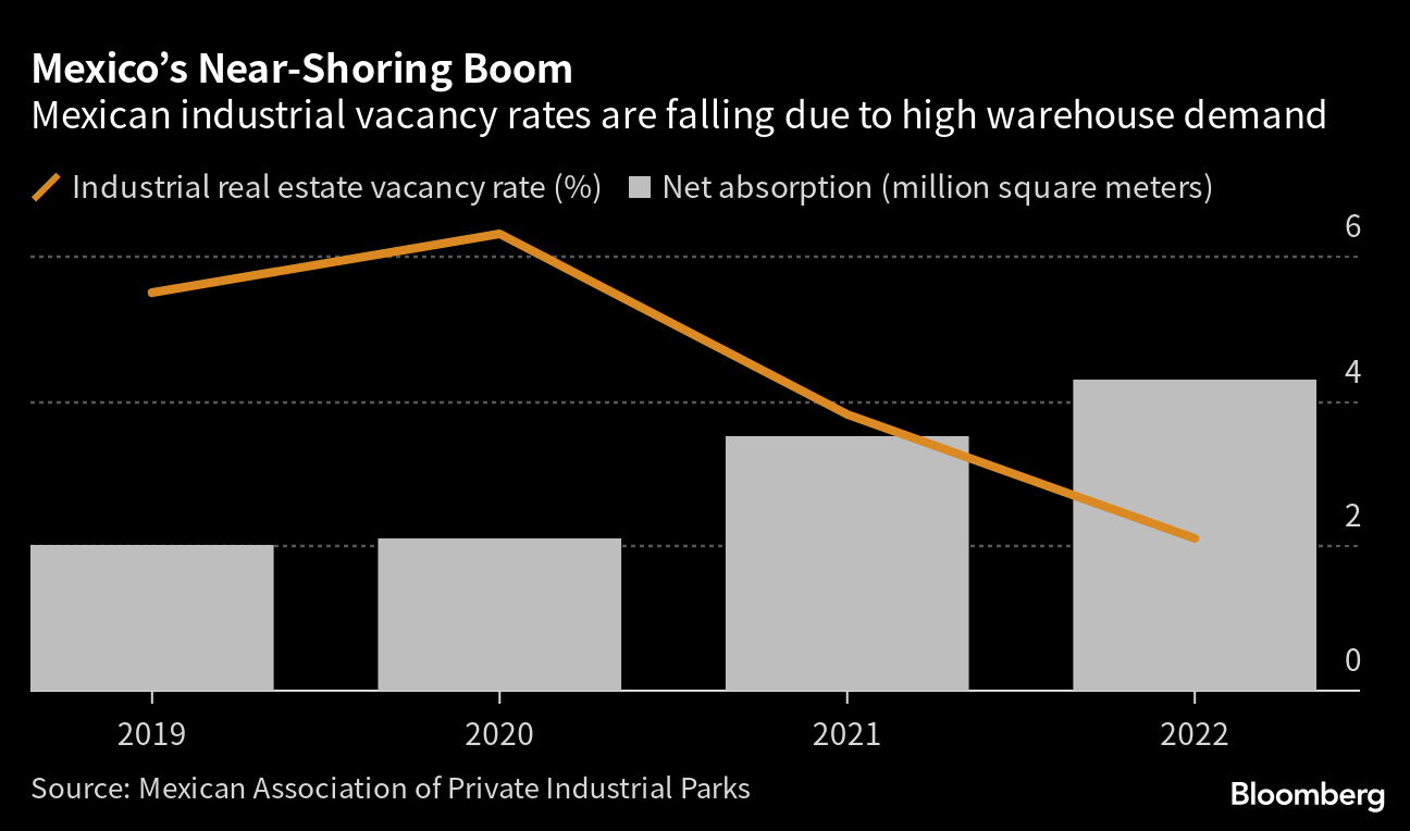 Mexico is becoming a key US sourcing alternative to China. Highly integrated US-Mexico supply lines and preferential trade treatment under the USMCA are helping to create investment opportunities across the border. Importers — and even some Chinese exporters — looking to diversify their supply chains are racing to snap up Mexican industrial space, which reached a 97.5% occupancy rate in 2022. Demand for warehouses and other industrial properties is particularly high along the US border near Tijuana where industrial vacancy rates are near zero. Some 47 new industrial parks are either planned or under construction, according to the Mexican Association of Private Industrial Parks.
