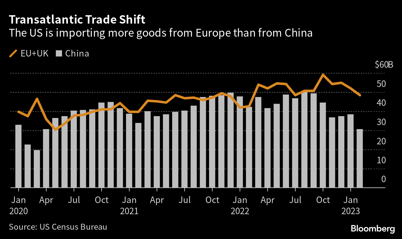 President Joe Biden's efforts to improve trade relations with Europe have resulted in a shift toward greater US reliance on imports from Europe than from China. The pivot came after the US and Europe shelved duties on bilateral trade worth $21.5 billion in 2021, paused an aircraft-manufacturing dispute dating to 2004, and launched talks to reduce overproduction of steel and aluminum. Over the past year, the value of US imports from Europe has increased by almost 13%, whereas US imports from China only grew by 6%.