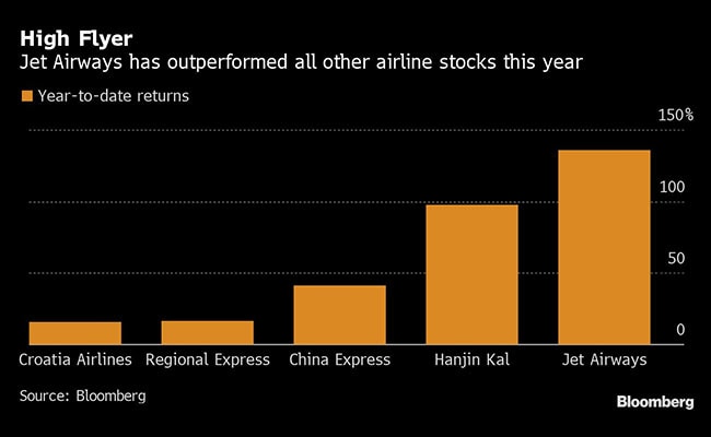 Stock in Mumbai-listed Jet Airways India Ltd. has surged almost 150% this year versus a 42% plunge in the 27-member Bloomberg World Airlines Index, which comprises the globe's biggest carriers.