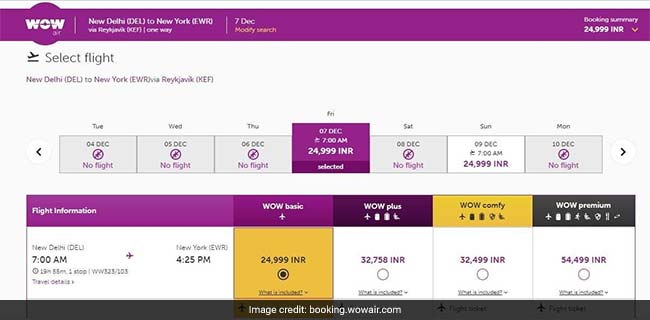 A search on the Wow Air bookings portal on Wednesday showed tickets for a flight from New Delhi to New York on December 7 were available from Rs 24,999 (basic fare).