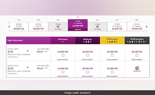Another search showed that the flight ticket from London to New Delhi is for Rs 21,999 under WOW basic on January 11.