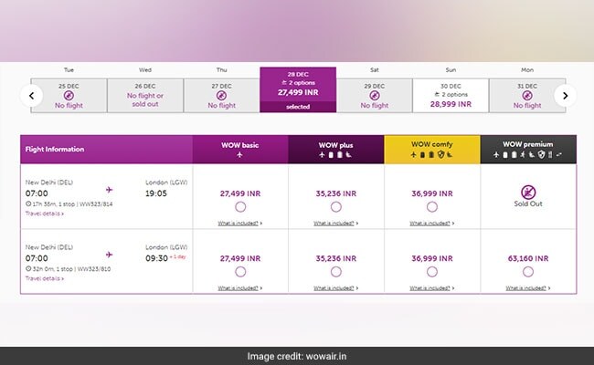 A search on the website showed that a WOW air flight ticket from New Delhi-London under WOW basic is for Rs 27,499 on December 28.