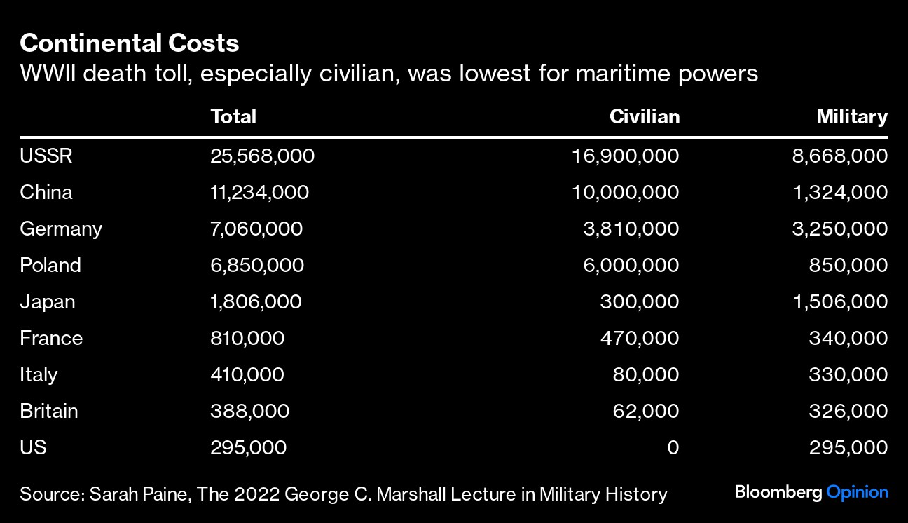 Paine says that to understand why China and Russia do what they do, you need to see them for what they are: continental powers in a global order that was organized over centuries by successive maritime powers, first British and then American. The difference is big. Maritime nations ultimately are about trade, and that in turn tends to attract allies and encourage the development of international rules because they enable wealth creation. The territorial wars that a continental world order based on spheres of influence implies are, by contrast, huge destroyers of wealth and value. Ukraine is a clear example. Sea powers do attack and subdue other countries, as the US did in Iraq and the British Empire in its many colonies. They also break the rules when it suits them. Yet the expeditionary wars they fight are necessarily smaller and overseas, taking a far lower toll on lives and wealth at home. Rarely do they conquer territory for its own sake, focusing more on containment and regime change to assert their interests. They also prefer stable to unstable neighbors because failed states tend not to do much trade. Continental powers, by contrast, care a lot about territory and will, at times, pursue its acquisition to their own economic detriment. Historically, continental powers also are prone to destabilizing neighbors if they can, either to later absorb them or ensure that no powerful threat emerges on their doorstep. That habitual, sometimes justified and, at other times, self-fulfilling paranoia also weakens their most likely trading partners.