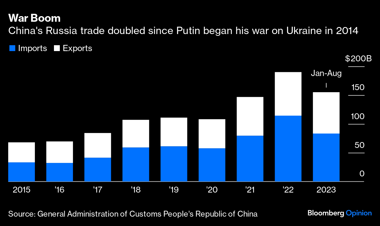 (Bloomberg Opinion) -- With hindsight, the last time Vladimir Putin visited Xi Jinping in China, just three weeks before Russia invaded Ukraine, was a moment of hubris — two supremely confident leaders marking their bid to shake up a world organized by and for the US and its allies. Well, they certainly shook it up, even if not in the way they intended. Putin's catastrophic error in attempting to invade a neighbor the size of France as though it were a glorified training exercise has, by some estimates, resulted in halving Russia's military strength. The supercar that was China's economy, meanwhile, has sputtered into the slow lane, with forecasts of when it will overtake the US in current dollar terms pushed into the future. So, it's tempting to imagine Xi and an increasingly dependent Putin humbled at their reunion, the sinews of their “unlimited'' bond already tearing. But that, to borrow a wonderful phrase from Sarah Paine, a professor of history and grand strategy at the US Naval War College, would be playing “half-court tennis” — the kind where you never see the next ball coming because you aren't paying attention to the other side's game.