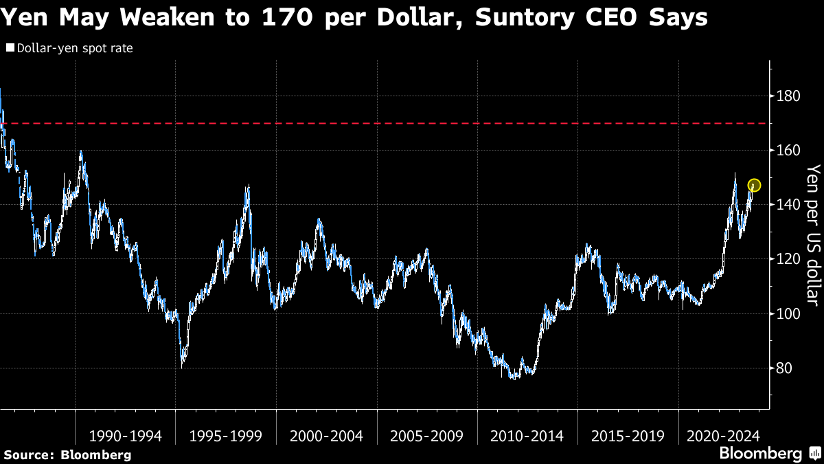 (Bloomberg) -- The Japanese yen, back near its weakest against the greenback in over three decades, may extend its bruising decline if the central bank sticks to a policy that's keeping interest rates low, Suntory Holdings Ltd. Chief Executive Officer Takeshi Niinami predicts.