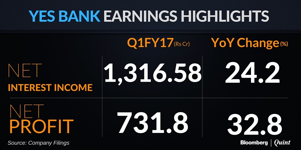 Yes Bank Ltd. beat analyst estimates in the first quarter of the financial year, reporting a 32.8 percent growth net profit at Rs 731.8 crore, according to a filing on the Bombay Stock Exchange. The Bloomberg consensus estimate stood at Rs 700.4 crore.