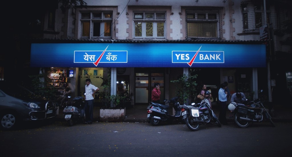 People stand near motorcycles parked in front of signage for Yes Bank Ltd. in Mumbai, India (Photographer: Adeel Halim/Bloomberg)