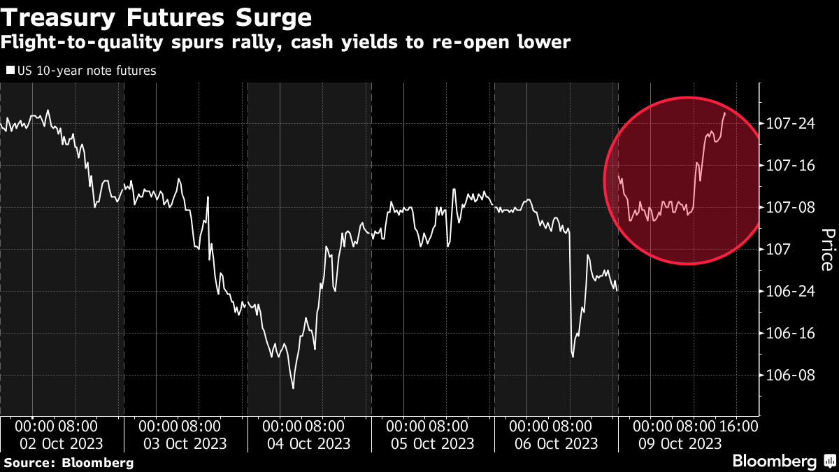 The futures market, open for its usual hours on Monday, surged as concern around conflict in the Middle East fueled a flight to quality. The 10-year note contract was higher by around 30 ticks as of 2:30 p.m. in New York, indicating a decline in yields of approximately 15 basis points versus Friday's 4.80% close. Exchange—traded funds tracking Treasuries also got a lift.