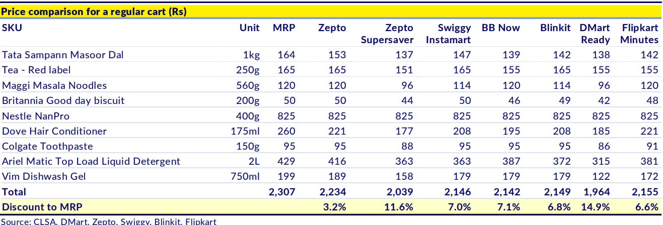 For the same regular cart, Swiggy Instamart was found to be offering a discount of 7%, and Zomato's Blinkit offered a discount of 6.8%, according to CLSA.