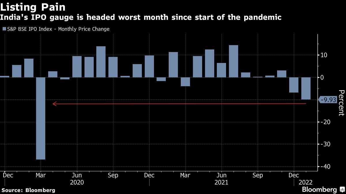 The S&P BSE IPO Index, which tracks firms for two years since their listing, has plunged about 10% since the start of the year and is headed for its worst month since March 2020 when the pandemic took hold.