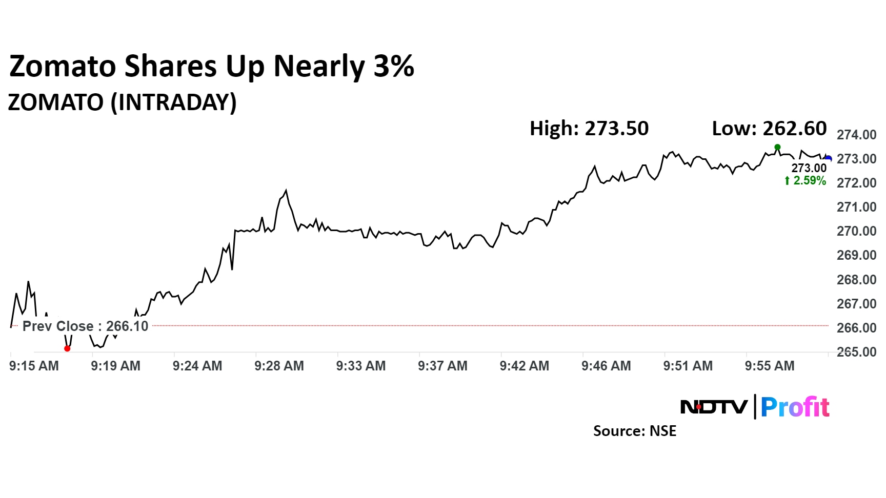 Zomato Ltd. stock rose as much as 2.78% during the day, before paring some gains to trade 2.16% higher at Rs 271.85 apiece, compared to a 0.28% advance in the benchmark Nifty 50 as of 10:22 a.m.