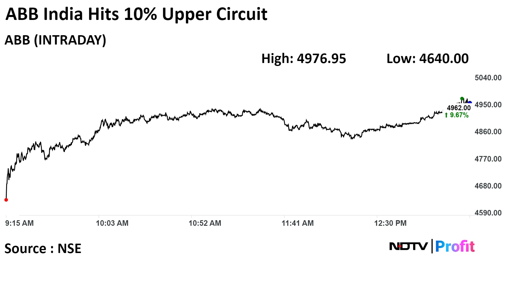 On the NSE, ABB's stock hit a 10.00% upper circuit, and rose to Rs 4,976.95 apiece, the highest since Jan. 11. It continued to trade in upper circuit, compared to a 0.09% advance in the benchmark Nifty 50 at 1:23 p.m.