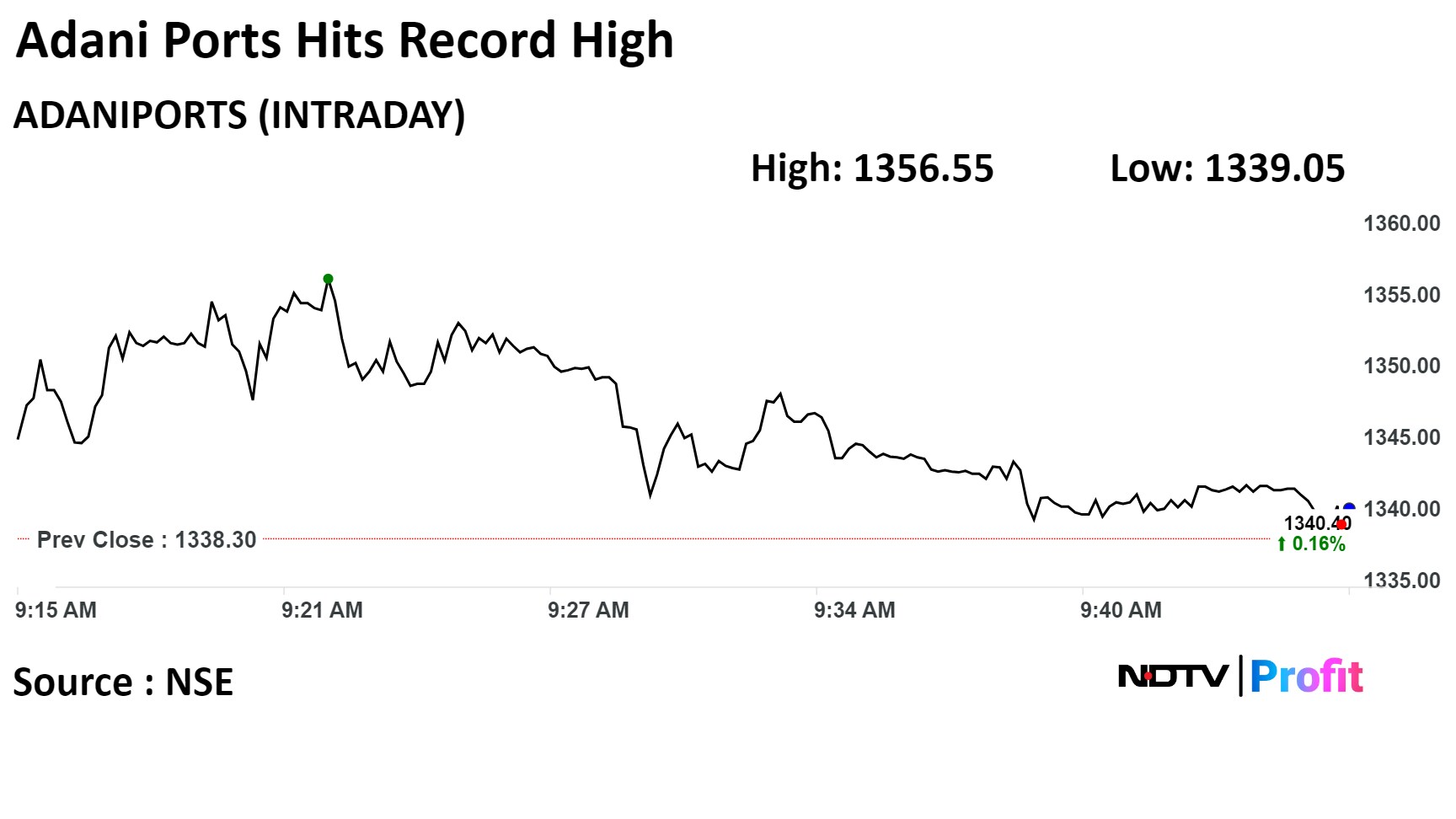Shares of Adani Ports rose as much as 1.36% to an all-time high of Rs 1,356.55 apiece on the NSE. The stock was trading 0.39% higher at Rs 1,343.55 per share compared to an almost unchanged benchmark Nifty 50 at 9:39 a.m.