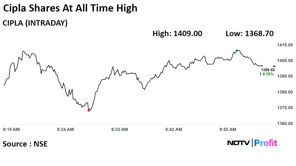 Shares of Cipla rose as much as 7.05% before paring gains to trade 6.51% higher at 9:57 a.m., compared to a 0.61% advance in the NSE Nifty 50.