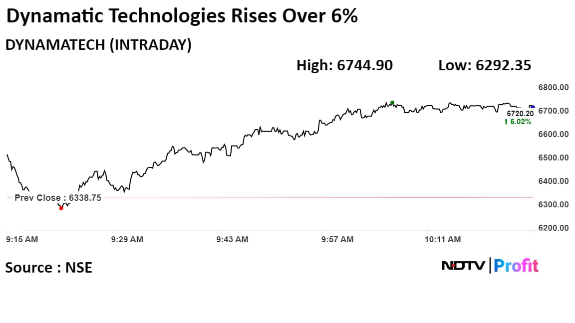 Dynamatic's stock rose as much as 6.41% during the day to Rs 6,744.90 apiece on the NSE. It was trading 6.28% higher at Rs 6,736.95 per share, compared to a 0.16% advance in the benchmark Nifty 50 as of 10:25 a.m.