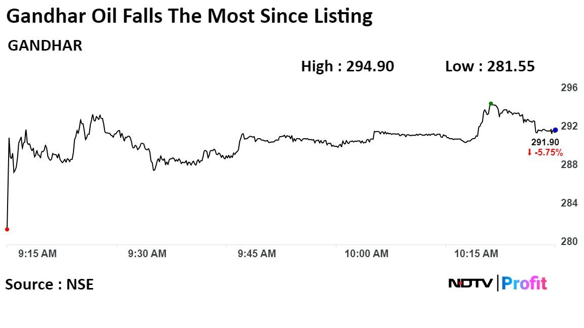 Gandhar Oil shares fell as much as 9.09%, before paring losses to trade 5.47% lower at 10:14 a.m., compared to a 0.04% advance in the NSE Nifty 50.