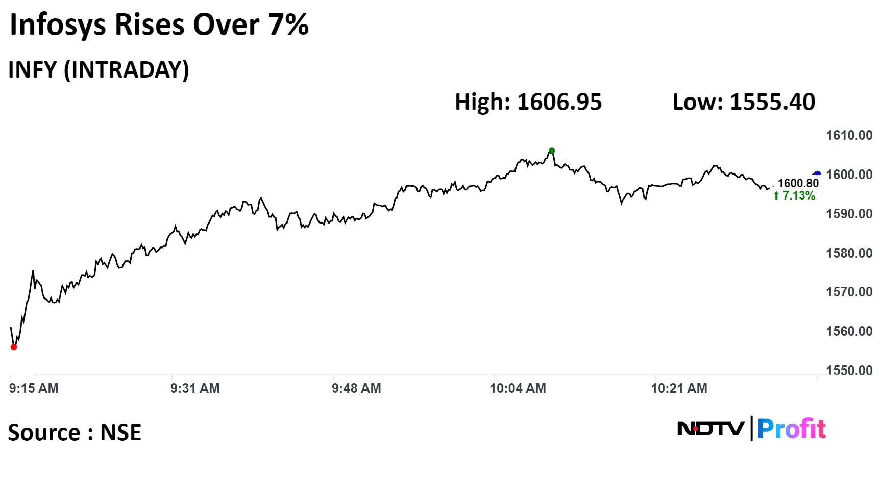 Shares of Infosys Ltd. rose over 7% as brokerages see growth potential on the back of new deal wins, even as its third-quarter profit missed analysts' estimates.