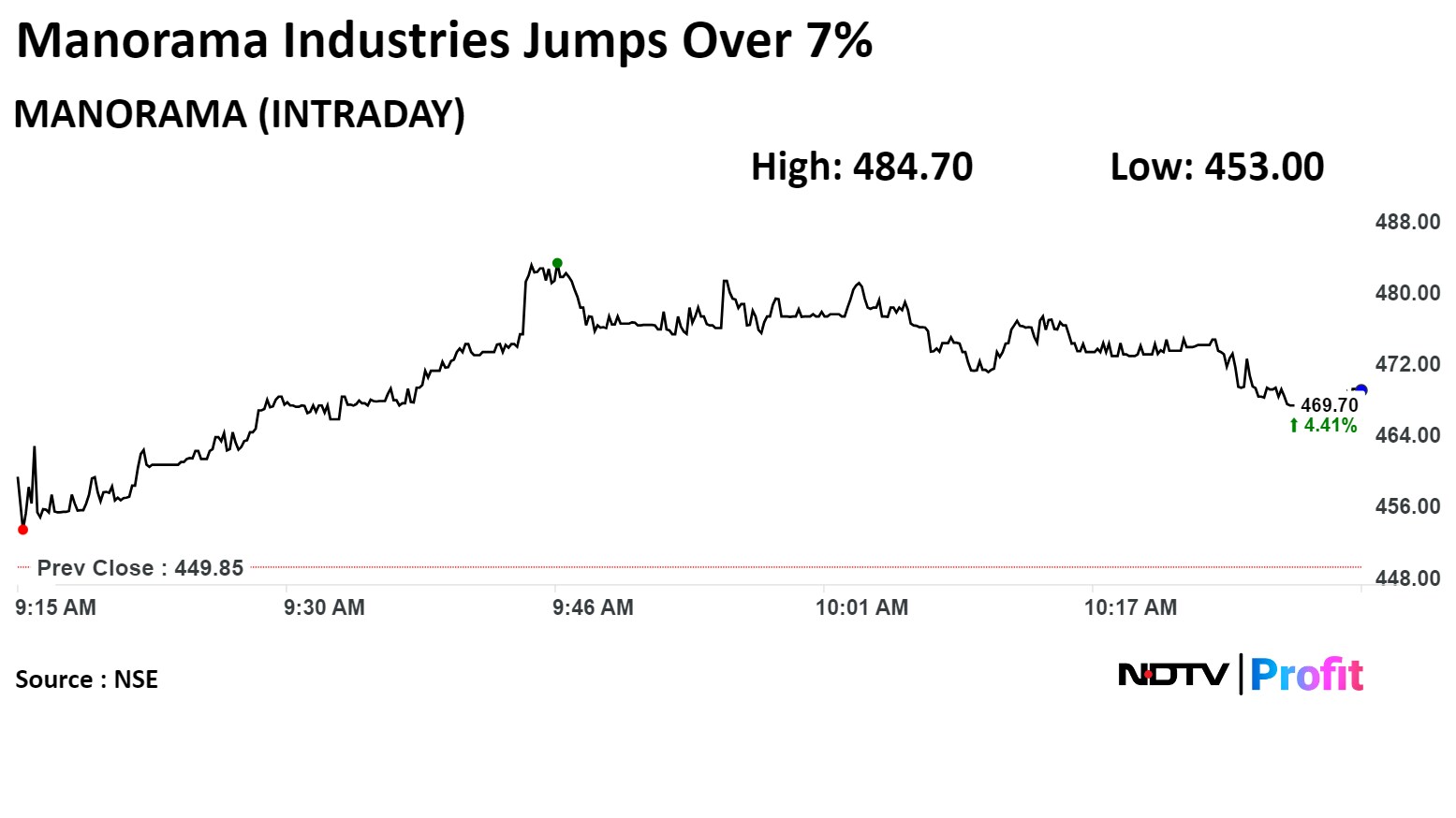 Shares of Manorama Industries rose 7.75% to Rs 484.70 apiece, the highest level since April 3. It was trading 6.3% higher at Rs 474 as of 11:47 a.m., as compared to 0.43% decline in the NSE Nifty 50 index.
