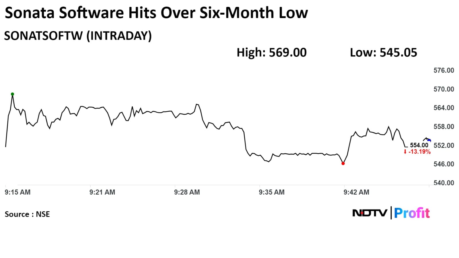 On the NSE, Sonata Software's stock fell as much as 14.6% during the day to Rs 545.05 apiece, the lowest since Oct. 26. It was trading 12.97% lower at Rs 555.05 apiece, compared to a 0.4% decline in the benchmark Nifty 50 at 10:08 a.m.