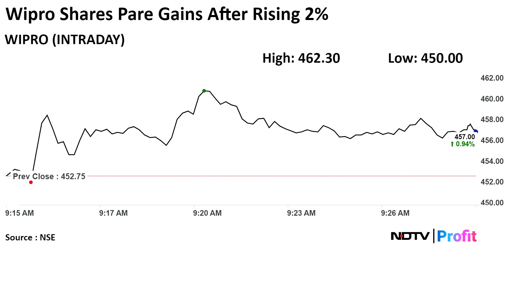 On the NSE, Wipro's stock rose as much as 2.11% during the day to Rs 462.30 apiece, the highest since April 15. It was trading 1.33% higher at Rs 458.55 apiece, compared to a 0.48% advance in the benchmark Nifty 50 as of 9:38 a.m.