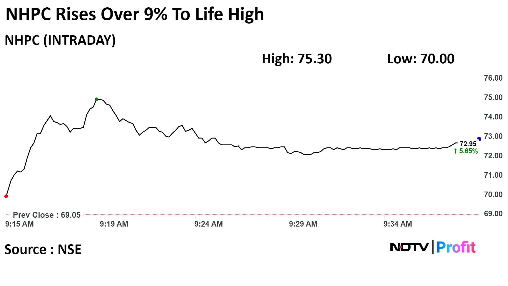 Shares of NHPC surged 9.05% to Rs 75.30 apiece, the highest level since listing on Sept. 1, 2009. It pared gains to trade 5.0% higher at Rs 72.50 apiece as of 09:52 a.m. This compares to a 0.33% advance in the NSE Nifty 50 Index.