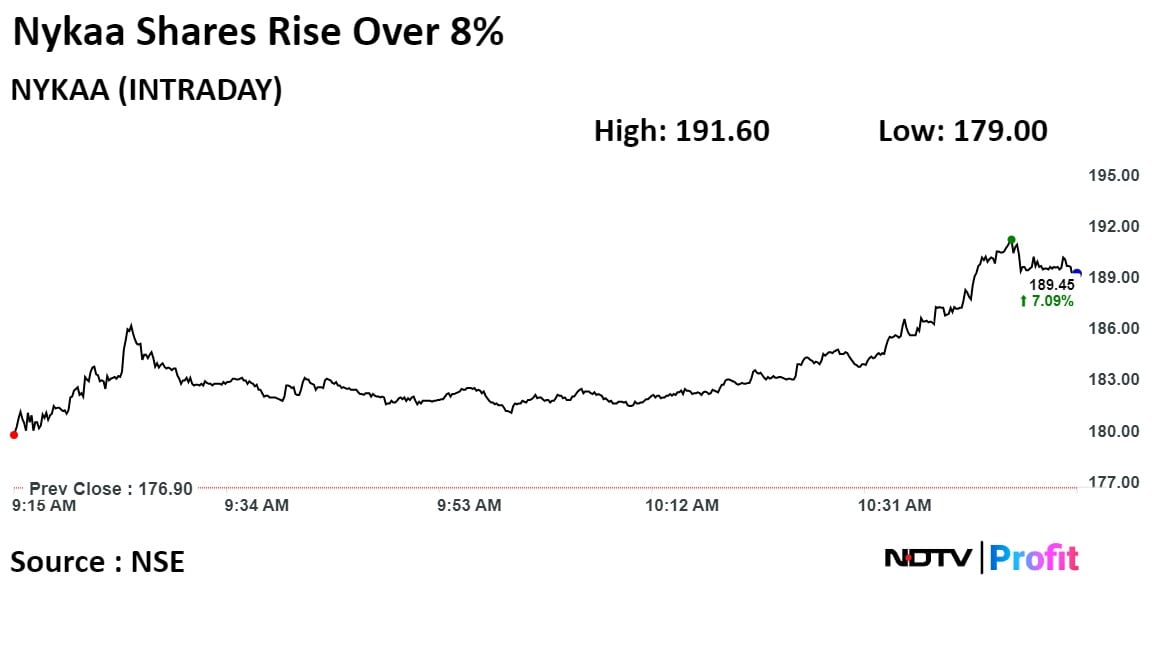 On the NSE, shares of Nykaa rose as much as 8.31% during the day to Rs 191.60 apiece, the highest since Nov. 11, 2022. It was trading 7.97% higher at Rs 191 apiece, compared to a 0.83% advance in the benchmark Nifty 50 as of 10:48 a.m.