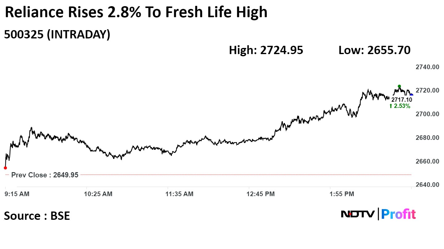 Shares of RIL rose as much as 2.83% during the day to a record high of Rs 2,724.95 apiece on the BSE. It was trading 2.61% higher at Rs 2,719 per share, as compared with a 0.07% advance in the benchmark Sensex at 3:01 p.m.