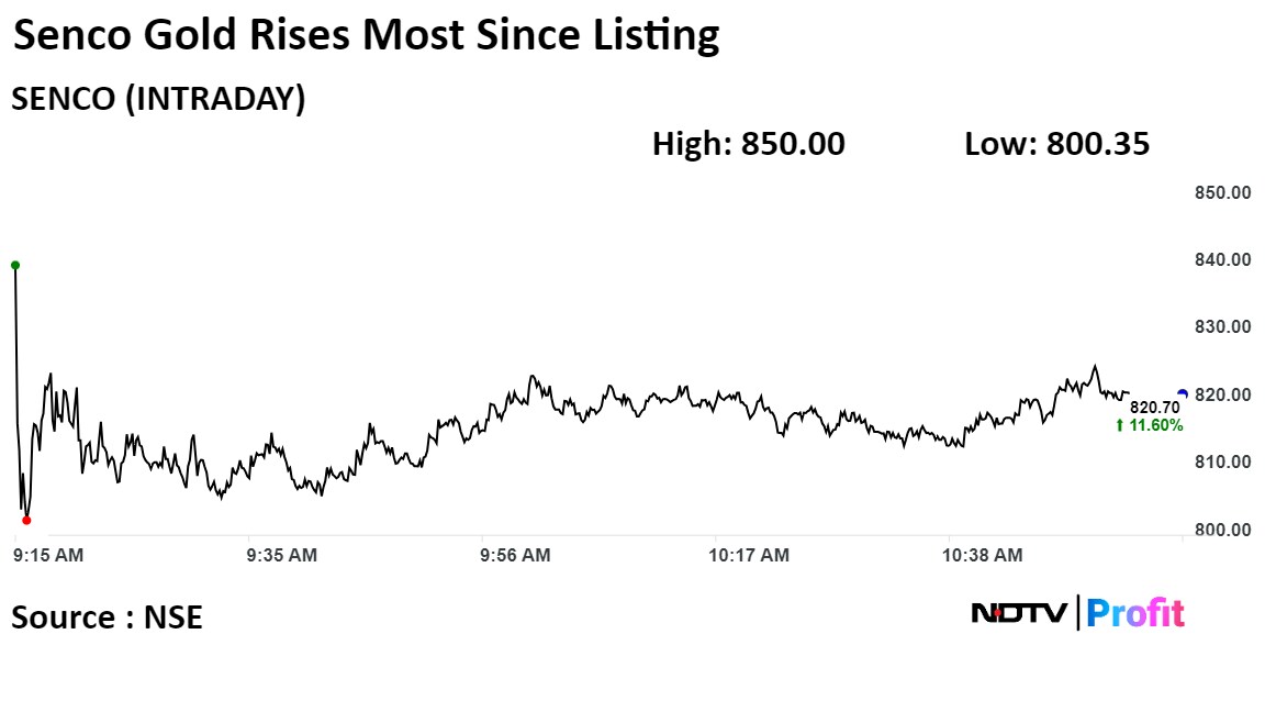 Shares of Senco Gold surged 15.58% intraday, the highest since listing on July 14, 2023. They pared gains to trade 11.97% higher, compared to a 0.13% advance in the NSE Nifty 50 as of 10:52 a.m.