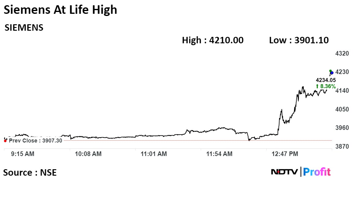 Siemens' stock rose as much as 8.64% during the day to Rs 4,245 apiece on the NSE. It was trading 6.65% higher at Rs 4,167.05 apiece compared to a 0.17% decline in the benchmark Nifty 50 at 1:49 p.m.