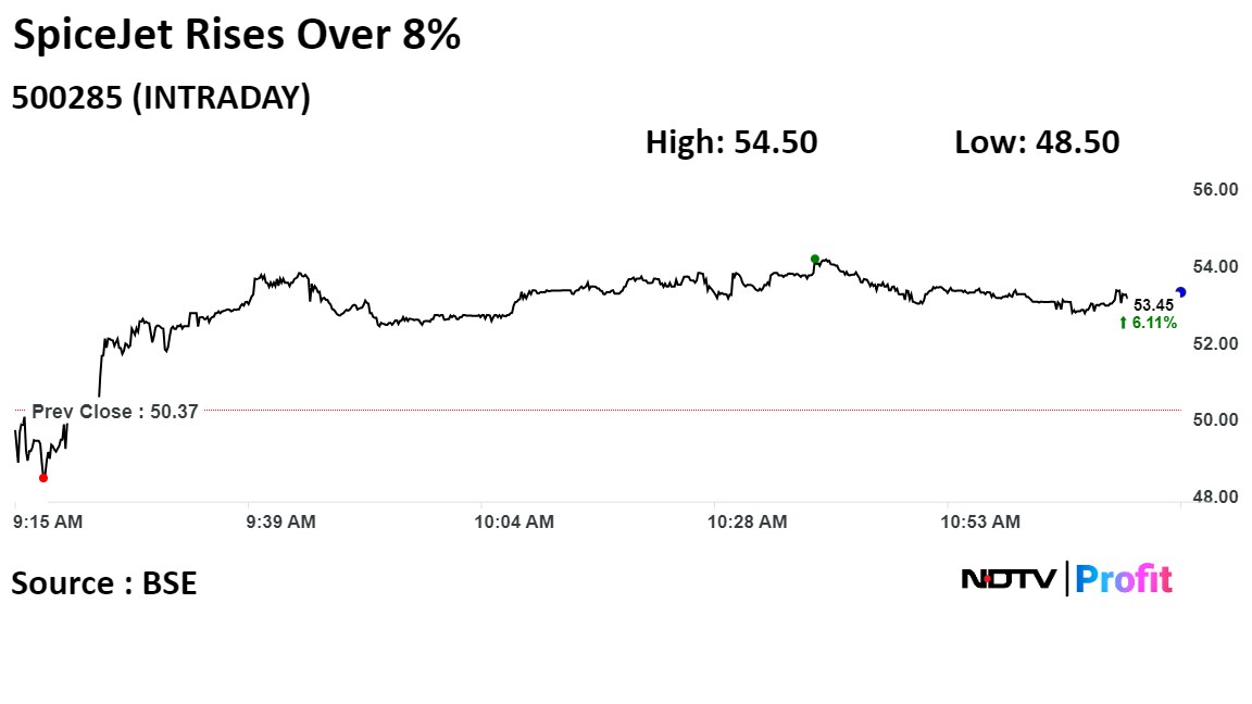 SpiceJet's stock rose as much as 8.20% during the day to Rs 54.50 apiece on the BSE. It was trading 5.82% higher at Rs 53.30 apiece, compared to a 0.27% advance in the benchmark BSE Sensex as of 11:15 a.m.